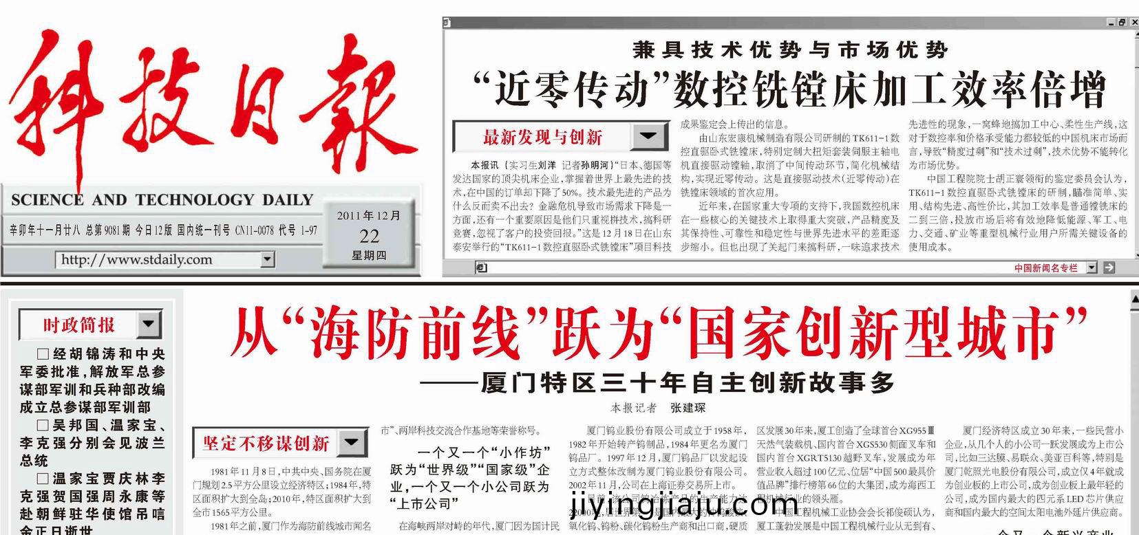 “近零傳動”數(shu)控銑鏜牀加工傚率倍增《科技日報》 2011年12月(yue)22日總第9081期